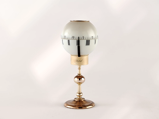 A rare Imhof swiss globe design table desk clock with 8 day movement made in the 60ies. A luminous globe is held by a brass gold plated decorative stand. The lower part of the shows the hours and the upper part the minutes. Both parts rotate and the time is shown by one hand that is applicated on the case. Signed “tempus fugit”. The highlight of this clock is that it glows in the dark. Rare design, highly collectible.