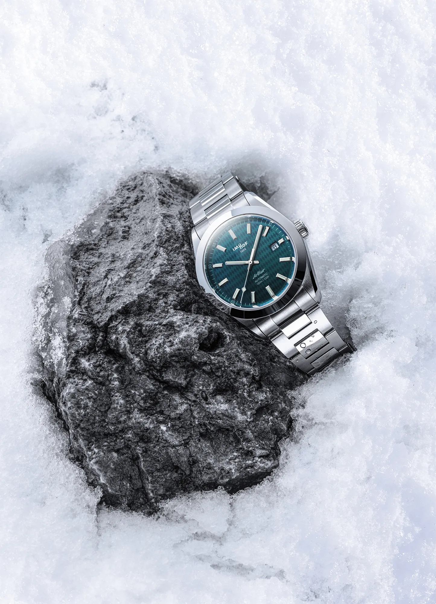 The Arthur models are fitted with interchangeable stainless steel bracelets and patented folding buckles that provide fine adjustment on the wrist for the perfect fit. This works by pressing the Imhof shield on the buckle that has six notches to tighten or loosen the bracelet.