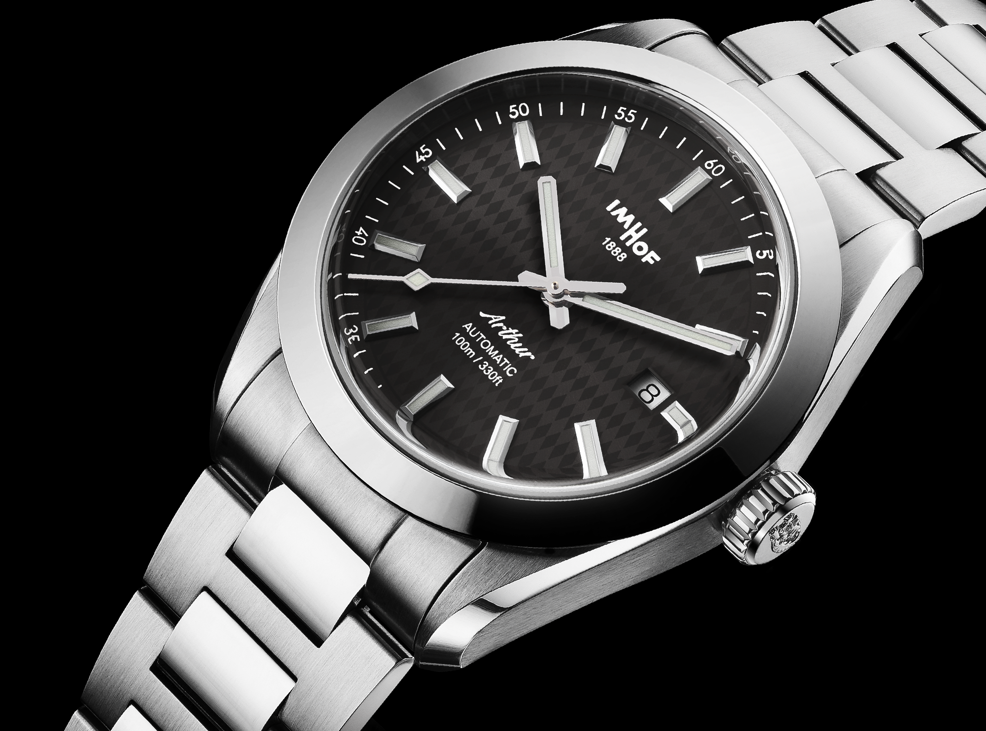 Interchangeable stainless steel 316L bracelets and patented folding buckles.