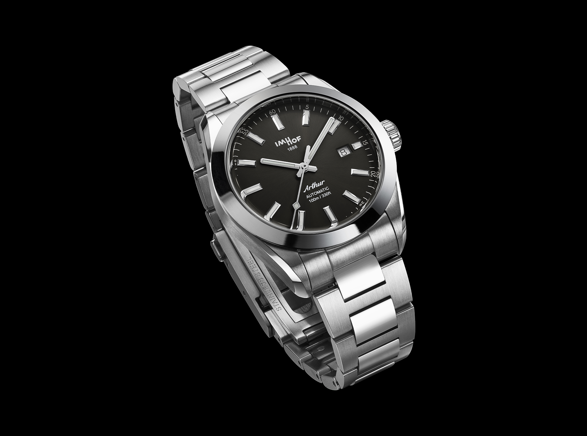 Interchangeable stainless steel 316L bracelets and patented folding buckles.