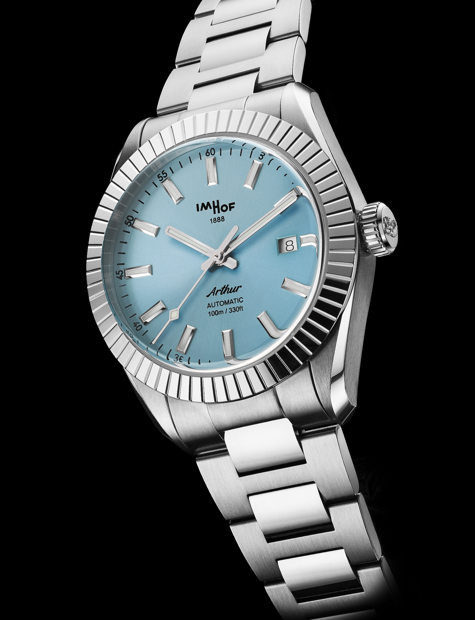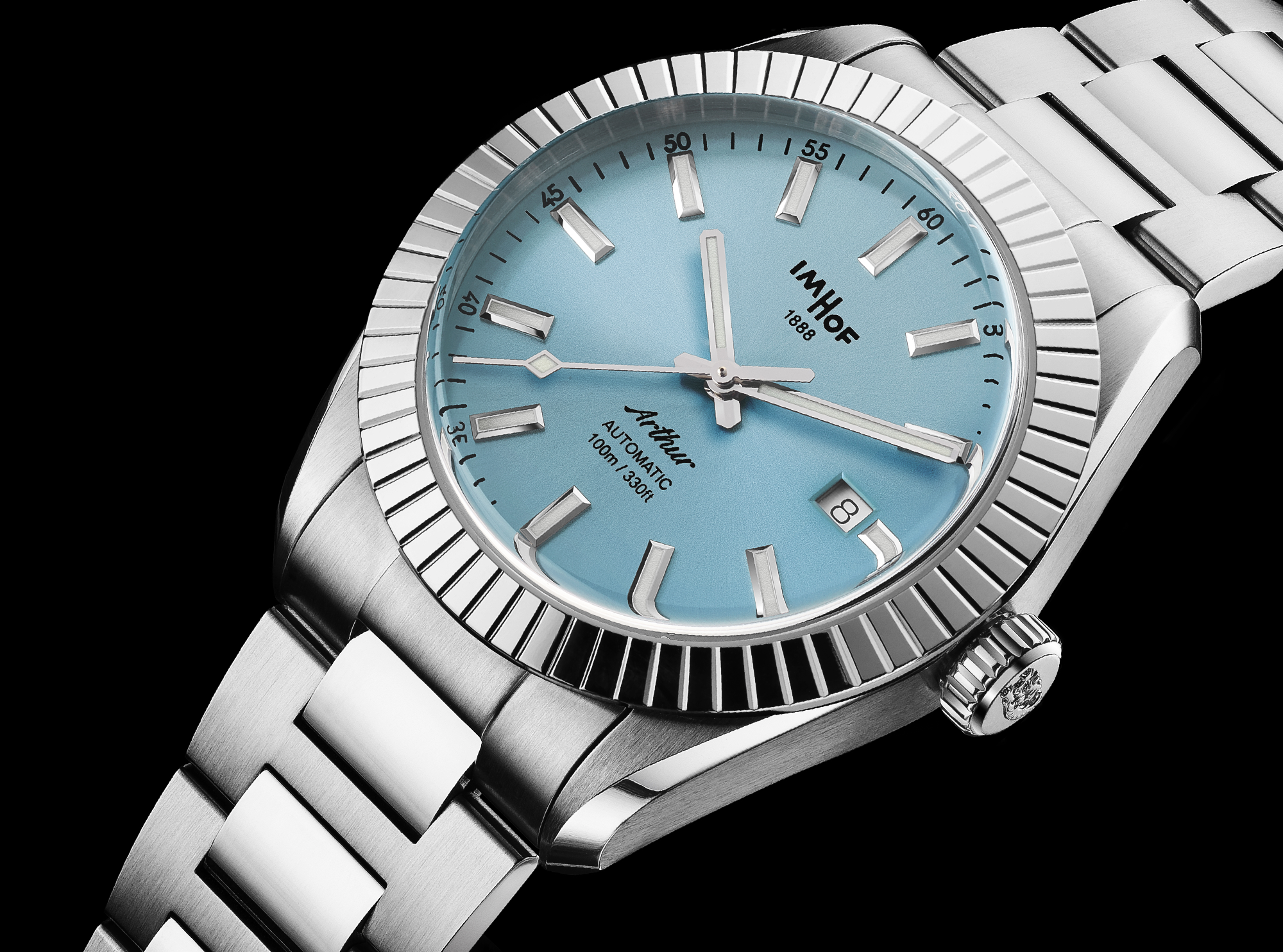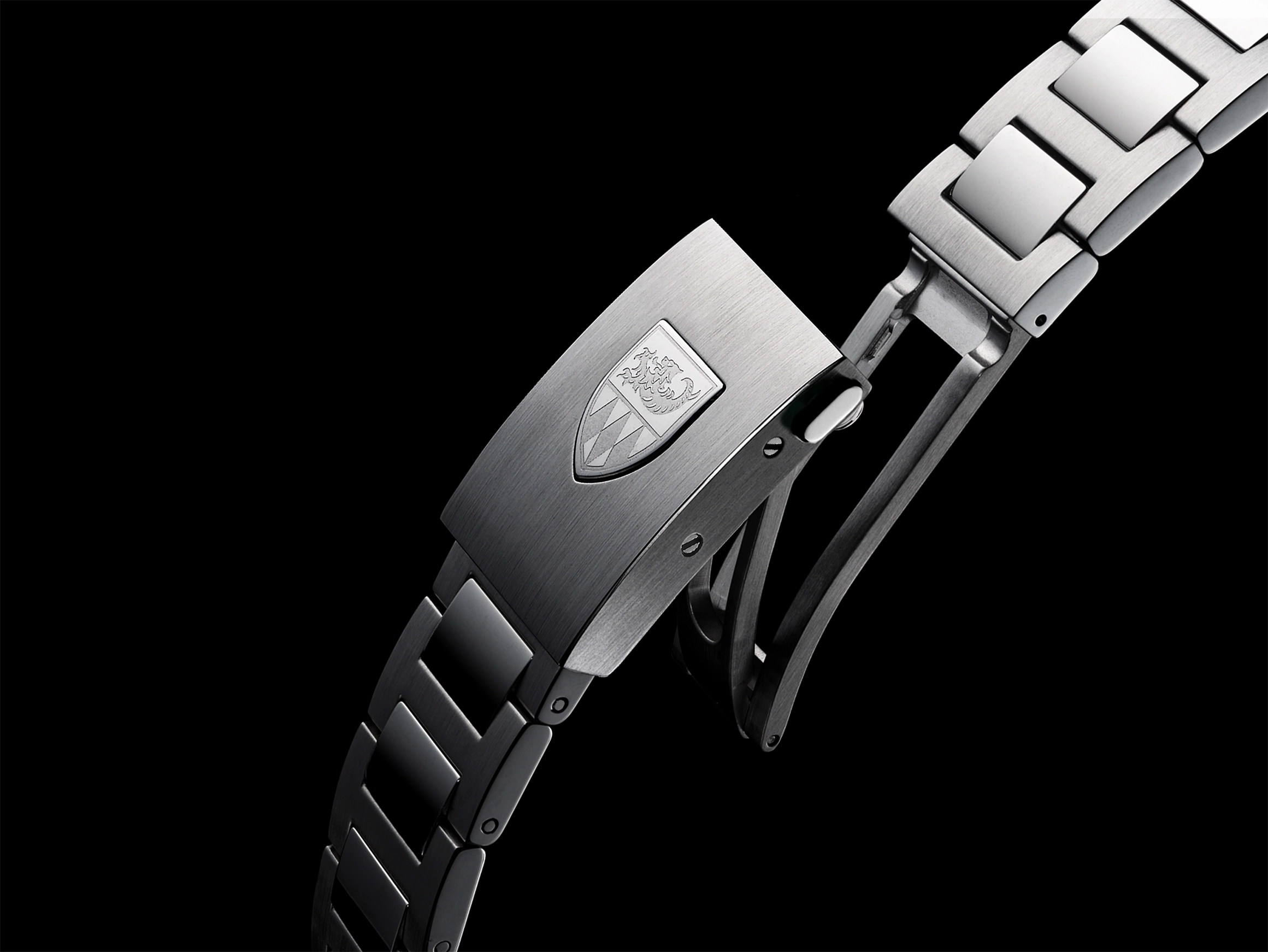 Interchangeable stainless steel 316L bracelets and patented folding buckles.