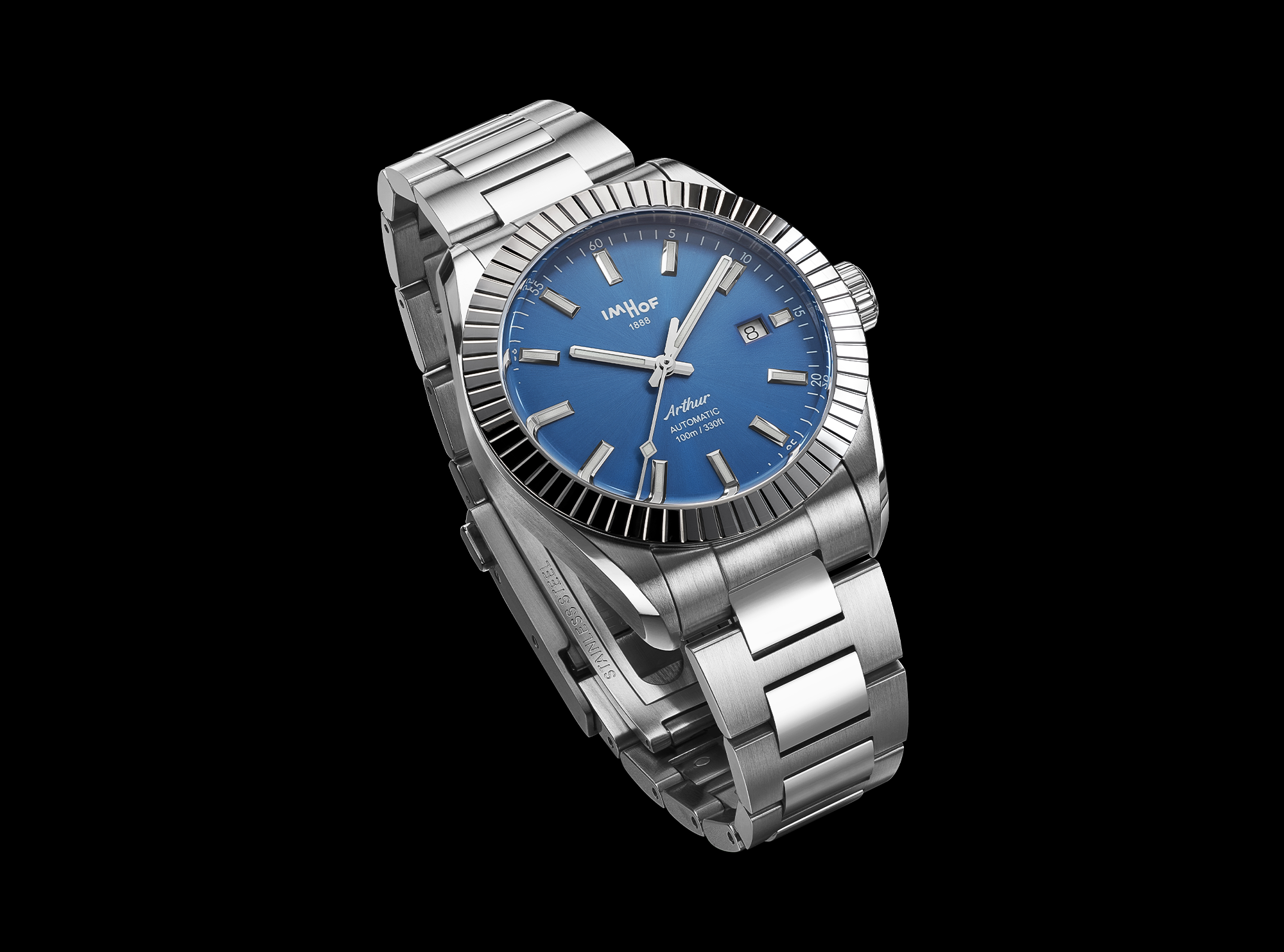 Interchangeable stainless steel 316L bracelets and patented folding buckles.