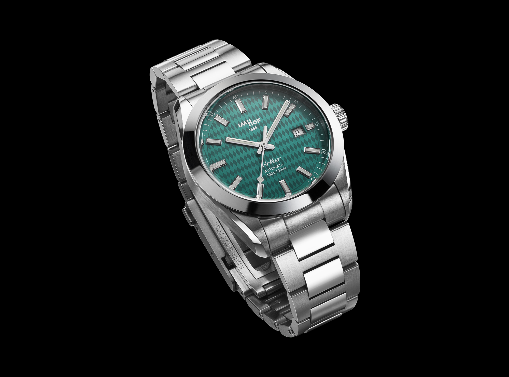 Interchangeable stainless steel 316L bracelets and patented folding buckles.