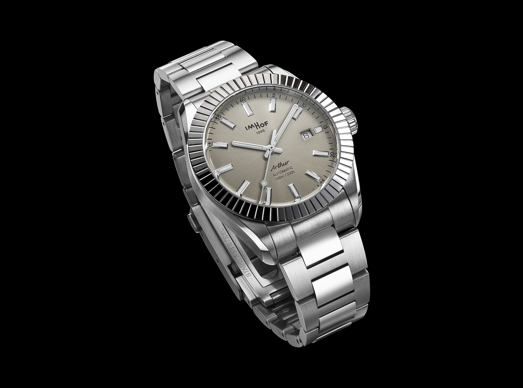 Interchangeable stainless steel 316L bracelets and patented folding buckles.