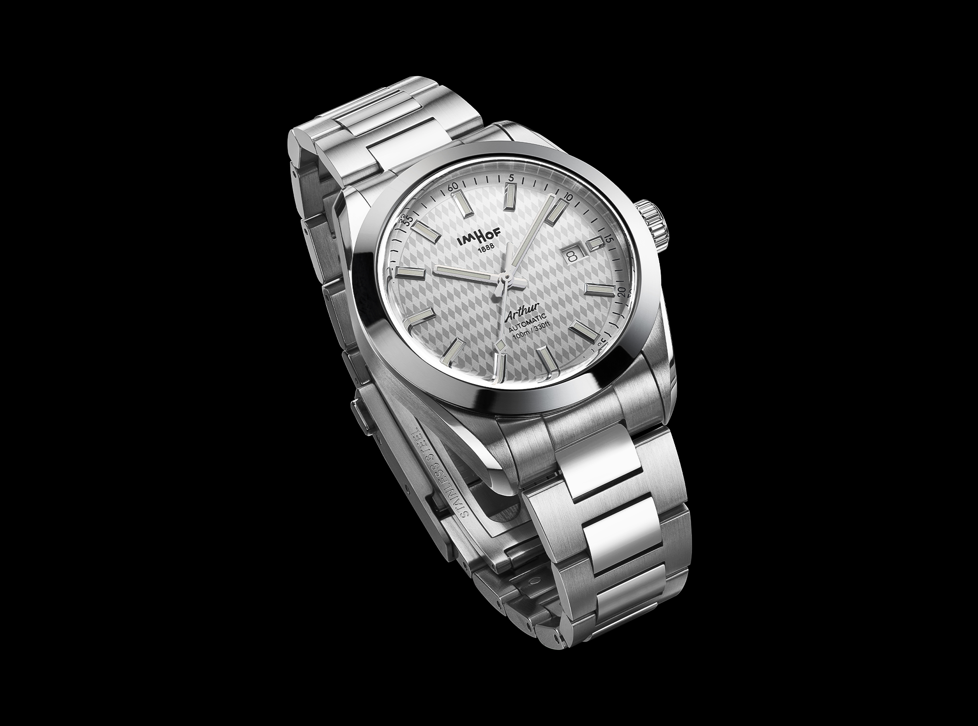 Interchangeable stainless steel 316L bracelets and patented folding buckles.